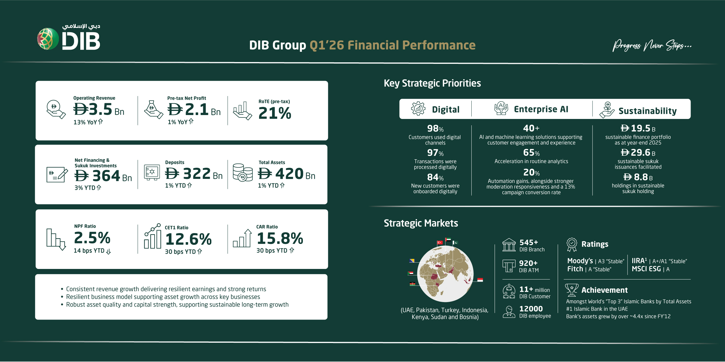 Dubai Islamic Bank (DIB) reported a strong start to 2026, delivering 13 percent year-on-year revenue growth with Q1 operating revenue reaching AED 3.5 billion, while total assets climbed to AED 420 billion.